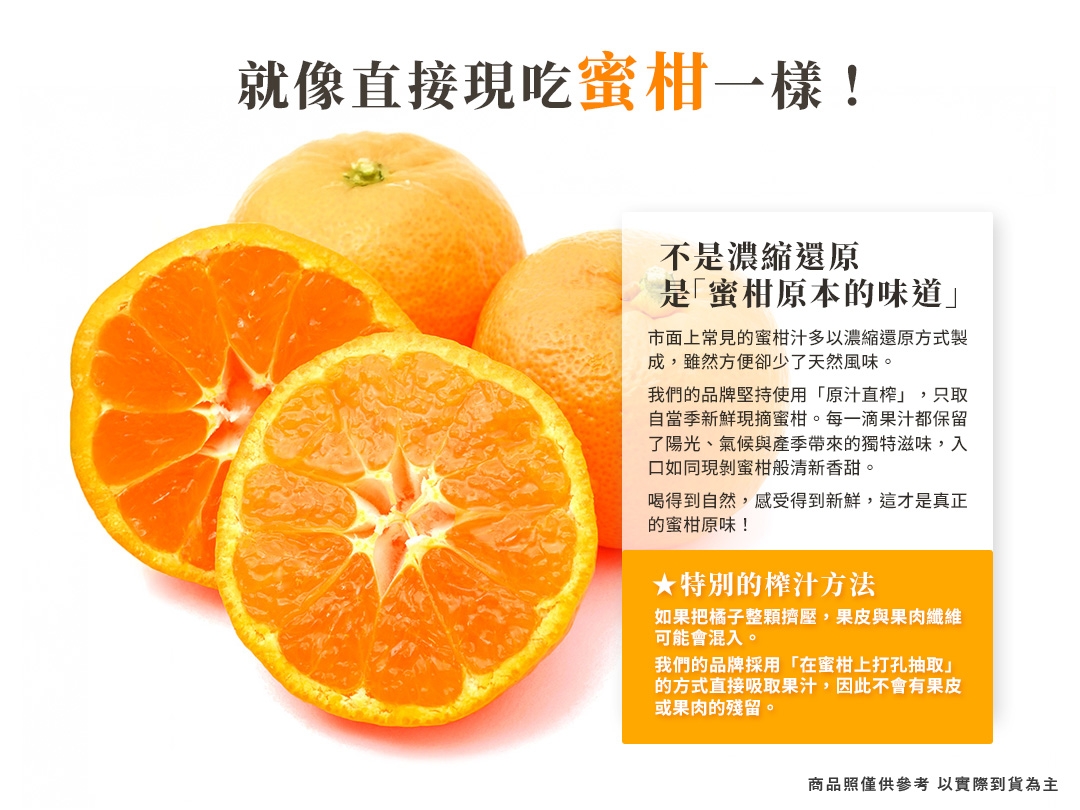 非濃縮還原,不加一滴水且未經過濾的100%純蜜柑果汁。