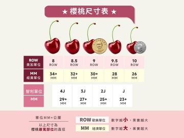 智利櫻桃的尺寸單位與美國櫻桃不同,會使用不同的代稱。