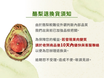 ❷ 酪梨皆是自然生長,由農民一顆顆手採,再經由長途運輸後抵達台灣;表皮會有採收、運輸時產生的輕微痕跡 ( 如:枝傷、碰撞等),並不影響實際口感喔!