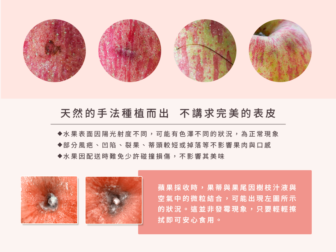 ❷ 蘋果皆是自然生長,由農民一顆顆手採,再經由長途運輸後抵達台灣;蘋果表皮會有採收、運輸時產生的輕微痕跡 ( 如:枝傷、碰撞等),並不影響實際口感喔!
